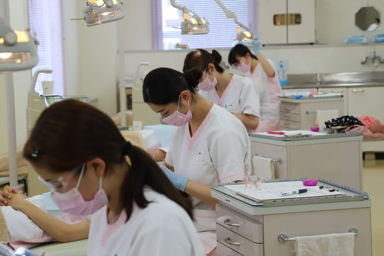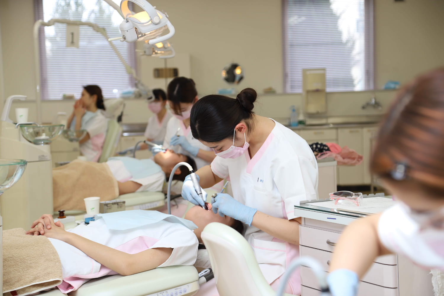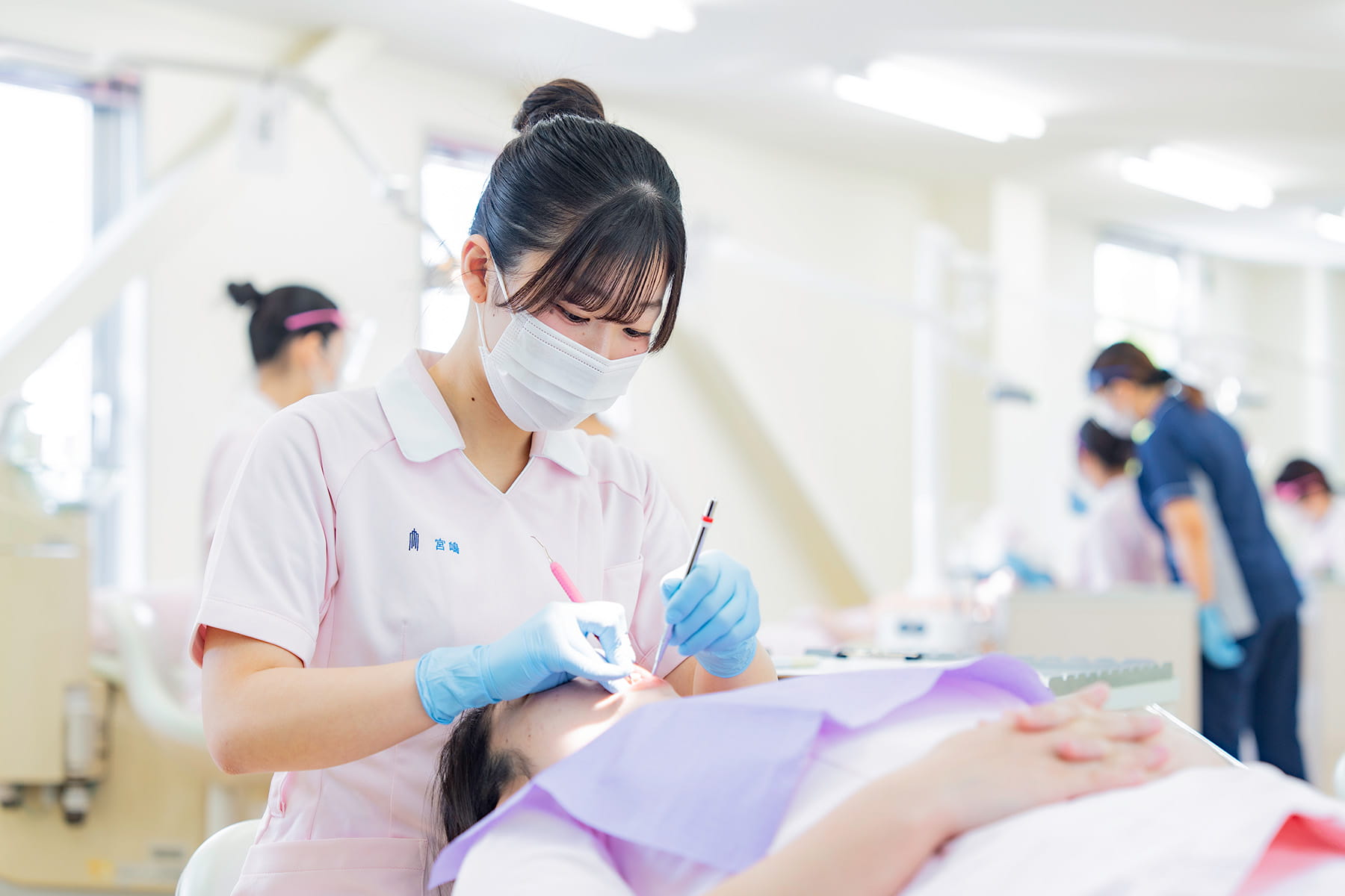 本物の歯科医院を再現した実習施設を完備。最新の充実した器材を用いながら実習を積み重ねて、技術の習得ができるようにします。実践を重視した学習で、就職後、すぐに活躍できる歯科衛生士を目指します。