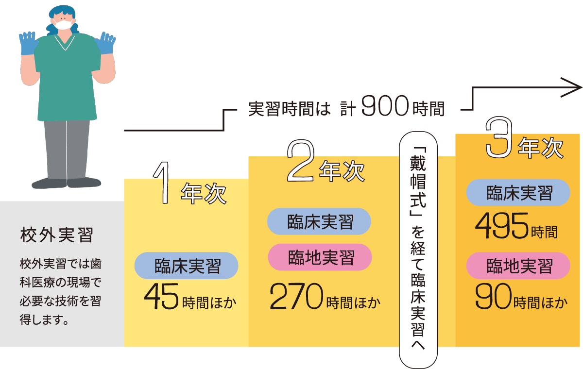 資格取得には、⾼校卒業後、⻭科衛⽣⼠を養成する⼤学・短⼤または専⾨学校、専⾨養成施設で3年以上学ぶことが必要です。