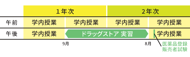 1年次の9⽉から2年次の8⽉までの1年間は、午前は学内授業、午後以降はドラッグストア実習[有償:1カ⽉80時間]を⾏います。