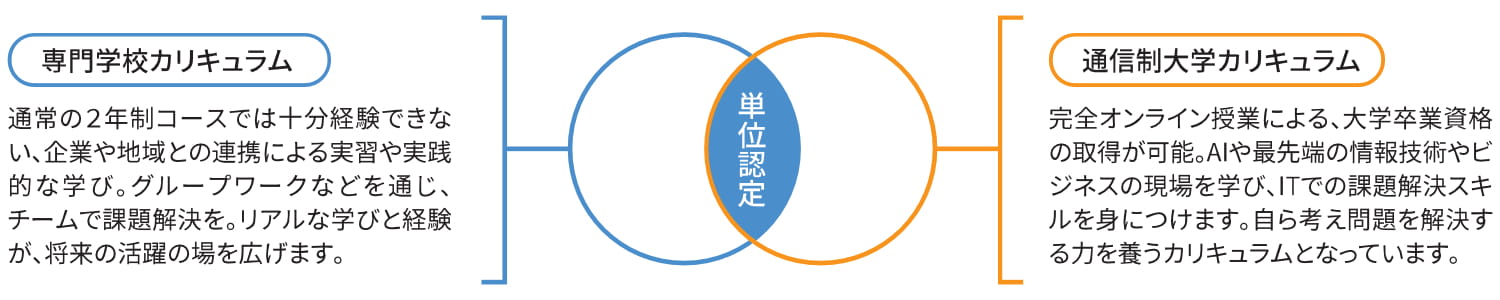 専⾨学校の必修単位のうち1/3程度を⼤学単位で補える!通常、専⾨学校4年+⼤学4年=8年かけて学ぶカリキュラムを4年間で履修可能に!