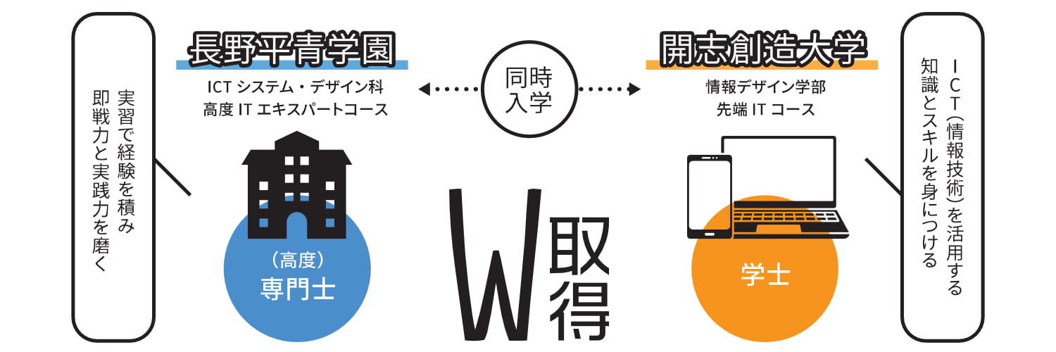 専⾨学校と⼤学、2つの学びを同時に進める⼤学併修コース。⼤学での学びによって取得した単位の⼀部は、専⾨学校の単位に認定されます。⼤学の講義は、⻑野平⻘学園で学ぶことができ、同じ志を持った仲間と⼀緒に、実践的な学びと学位取得を⽬指すことができます。
