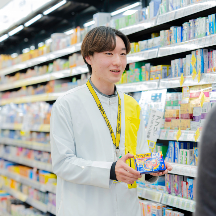 専⾨的な医薬品や⼈体の知識に加え、デュアル実習で在学中から実務経験を積める点が⼤きな強み。資格取得後、早期に管理者なれる点も他にはないと感じます。⽇々の勤務を通して「もっと良くできないか」と⼀歩踏み込んで考える⼒が⾝につきました。平⻘学園での学びは知識や技術にとどまらず、⼈の困りごとを解決し、暮らしに安⼼と喜びを届ける⼀⽣モノの武器になります。